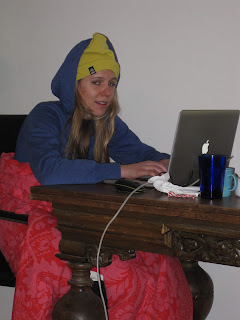 Hopefully, when we come back Helsinki will feel more warm. Here's an image of Sally from Tuesday night as we piled on the layers just to be functional in our apartment: